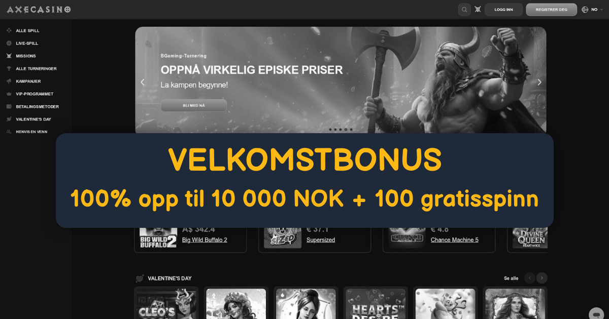 Axe Casino ønsker deg velkommen til en verden av spenning og gevinster skreddersydd for norske spillere. Start reisen din med vår generøse velkomstbonus på 100% opptil 8000 NOK, som gir deg ekstra midler å utforske det beste online casino har å by på. Med lave omsättningskrav på bare 35x kan du raskt komme i gang uten unødvendige begrensninger. Som lisensiert av Curacao eGaming sikrer vi et trygt og rettferdig spillmiljø for alle. Nyt fordeler som lynraske uttak innen 24 timer, dedikert 24/7 kundestøtte på norsk og en brukervennlig plattform som passer perfekt til ditt liv. Vårt utvalg inkluderer tusenvis av spilleautomater, klassiske bordspill og live casino-action fra ledende leverandører som NetEnt, Pragmatic Play og Evolution. Enten du foretrekker de nyeste slots eller strategiske kortspill, finner du alt her. Vår mobilvennlige versjon lar deg spille sømløst på telefon eller nettbrett, mens sikre innskudd via Visa, Mastercard, Skrill og BankID gjøres i et øyeblikk. For rask utbetaling casino i Norge er Axe Casino det ultimate valget – trekk ut gevinstene dine raskt og enkelt. Bli med i dag og opplev mobil casino bonus som booster din spillopplevelse fra første spinn.